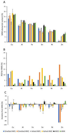 Despite the large sample mass used and the combustion of plastics prior to elemental analysis, there was still significant variation in the metal content of the smelted samples. Contributing to this variability was the volatilisation of zinc as well as the mobilisation of metals due to the formation of HBr from BFR. The smelted samples analysed with AM1 and AM2 had the largest RSDs of any of the methods used and, as such, the lowest precision. The precision could be improved by collecting any volatilised metals in a baghouse filter for subsequent analysis using ICP-OES [56] as well as by conducting the process at a temperature below 900 °C to prevent the volatilisation of zinc [54]. This could make smelting a more viable method to characterise PCBs.
