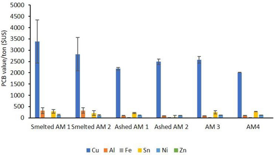 Smelting PCB samples resulted in the highest copper content for both AM1 and AM2 compared to all other AMs. However, smelting also had the largest RSD for copper. This large variation in metal content in samples from smelting can be a result of the non-metallic composition of PCBs. One common component of PCBs is BFR [59]. BFR are used to inhibit combustion reactions and reduce the flammability of PCBs [60]. The most commonly used BFR is tetrabromobisphenol A (TBBPA) [60]. It is used in over 70% of all electronic and electrical equipment worldwide [61]. The rapid decomposing of TBBPA during thermal processing has been well characterised [59,62,63]. During the thermal decomposition of TBBPA, a range of phenol-based products are formed, but the most common product is HBr [61]. Although the decomposition of TBBPA starts at 180 °C, it is not significant when the temperature is below 270 °C [63]. However, when the temperature is increased to 320 °C, over 90% of TBBPA are decomposed, with full decomposition occurring at 500 °C [61].