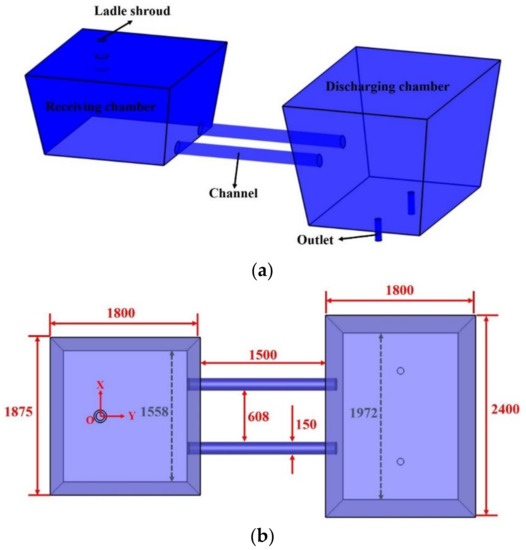 Tundish metallurgy has assumed considerable importance and, accordingly, many innovations were systematically introduced in the academic steelmaking area [1,2,3]. This progressive demand for high-quality steel has prompted more researchers to more closely evaluate the different steps in the tundish metallurgy process, where it is possible to facilitate the removal of inclusions in molten steel [4,5,6,7,8,9,10]. Many complex metallurgical processes and phenomena, such as high temperature, chemical reaction, electromagnetic field, visual opacity, etc. will be inconvenient and dangerous to directly measure or undertake physical experiment research in continuous casting equipment. With the availability and practicability of less expensive high-performance computers, mathematical modeling, along with physical modeling, has become a reasonable alternative route for investigating fluid-dynamic behavior in the tundish. The fluid flow behavior in the tundish using physical and mathematical modeling have been investigated in the published literatures [11,12,13,14,15,16]. Previous studies have shown the influence of the shapes, operating parameters, flow control devices (dam, weir, slotted baffles with inclined holes, turbulence inhibitors), gas injection in conjunction with flow modifiers on macroscopic fluid transport behavior, etc. [17,18,19,20,21,22,23,24,25,26,27,28]. The important flow behavior of tundish which would help to achieve better performance of the tundish with respect to inclusion separation and float out, minimum dead volume, large ratio of plug to dead volume, relatively large ratio plug to mixed volume and the maximum average residence time.