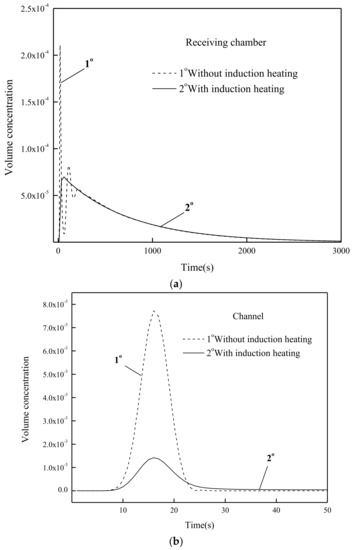 Table 7 shows the fluid flow characteristics by individual unit method for the two conditions. Some noteworthy information is expressed as follows: (1) In the case of without induction heating, the residence time of molten steel are 544.4 s, 16.2 s and 907.4 s in the receiving chamber, channel and discharging chamber respectively. In the case of induction heating, the residence times of molten steel are 547.2 s, 17.5 s and 996.8 s. The large recirculation zone will increase the flow path for molten steel and will improve the mixing effect in the discharging chamber and the temperature of molten steel will become more uniform in the discharging chamber [34]. This phenomenon of recirculate flow will enhance the mixed volume and increase the inclusion collision-coalescence and grow up [32]. (2) In the receiving chamber without induction heating, the mixed volume is 2.075 , it occupies 73.4% of the volume; the plug volume is 0.063 , it occupies 2.2% of the volume; the dead zone volume is 0.688 , it occupies 24.3% of the volume. In the receiving chamber with induction heating, the mixed volume is 2.004 , it occupies 70.9% of the volume; the plug zone volume is 0.145 , it occupies 5.1% of the volume; the dead zone volume is 0.677 , it occupies 24.0% of the volume. The two results show that the main flow behavior of molten steel is mixed flow in the receiving chamber. (3) In the channel, it can be found that the dead zone volume are −0.003 and −0.007 , respectively, for two cases. Although the value is negative, but it is close to zero, it may be caused by numerical errors. For case 1 and case 2, the two results of plug volumes have the same result, with a value of 0.051 , accounting for 83.6% of the channel volume. The result shows that the main flow of molten steel in the channel is plug flow. (4) In the discharging chamber, the mixed volume are 3.218 and 3.879 respectively, it occupies the 61.36% and 73.97% of volume. The numerical result shows that the main flow behavior of molten steel is mixed flow in the discharging chamber.