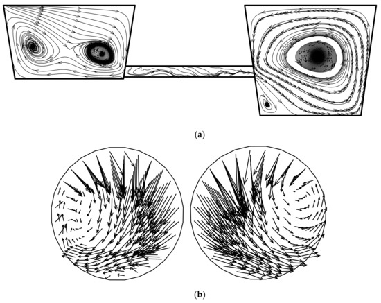 Velocity vector in the tundish with and without channel induction heating. (a) Without induction heating, × = −0.379 (YZ plane); (b) With induction heating, × = −0.379 (YZ plane).