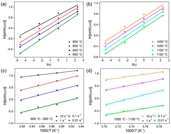 - Based on the experimental data, the processing maps were obtained. For the ferrite matrix condition, the feasible regions are in the 850–950 °C range with strain rates of 0.4–10 s−1 and 800–950 °C with strain rates of 0.01–0.03 s−1, respectively. For the austenite matrix, the feasible region ranges from 1000 °C to 1150 °C with strain rates of 0.01–0.05 s−1.