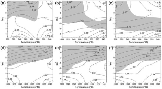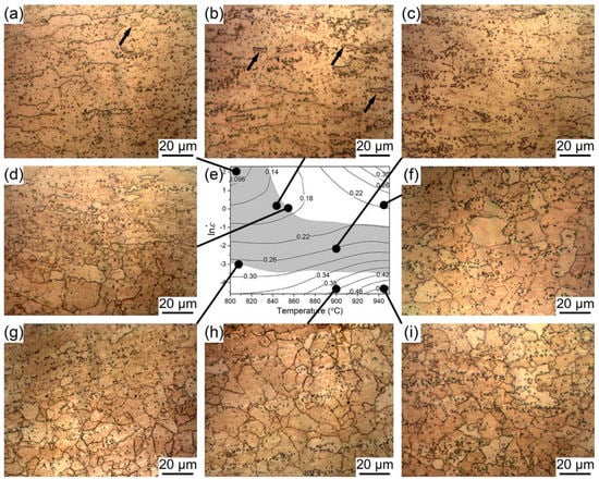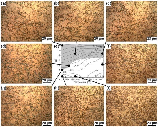 - In the safe domains, with an increase in , the grains are gradually refined, showing a typical recrystallization structure. However, in the instable domains, the grains are elongated and separated without recrystallization, showing typical rheological-instability characteristics.