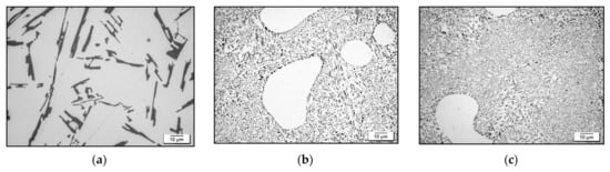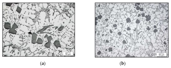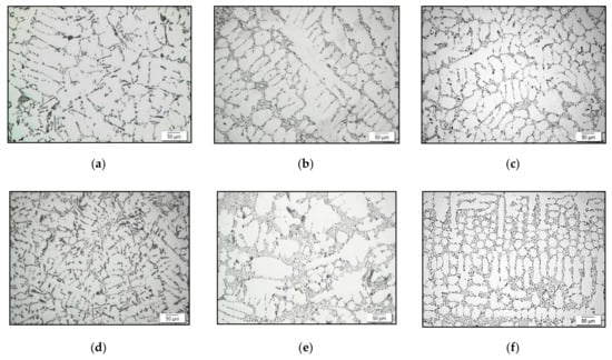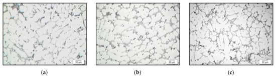 The main structural components of hypoeutectic Al–Si casting alloys are α-Al dendrites and aluminium–silicon eutectic (Figure 3a,b).