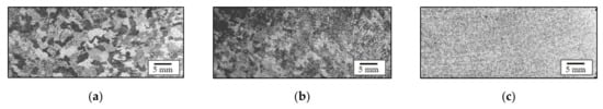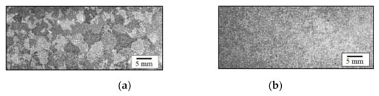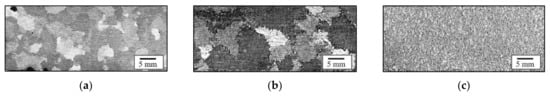 Treatment of alloy 4 with such fluxes results in the refinement of eutectic silicon, and the particles of eutectic silicon become globular (Figure 1b,c). The average area of eutectic silicon particles in a modified alloy is two orders of magnitude smaller than the area of eutectic silicon in an unmodified alloy (Table 2). However, treatment with a complex flux (Figure 1c) leads to a greater fragmentation of the eutectic compared to treatment with a standard flux (Figure 1b). The average particle area of eutectic silicon decreases from 0.56 μm2 for standard flux to 0.48 μm2 for complex flux. The developed flux also affects the α-Al dendrites, SDAS in alloy 4 was reduced by 27% (Table 2). Titanium, as a component of the flux, facilitates refinement of the alloy macrograin, as clearly seen in the photographs of the macrostructure (Figure 2c). The standard flux does not change the macrograin size (Figure 2b) compared to the unmodified alloy (Figure 2a). Due to grain refinement, the mechanical properties of the alloy are also improved. Compared to the unmodified alloy, the relative elongation increases 5.4 times (12.2%) and the tensile strength increases by 25% (175 MPa). The resulting values are lower in the case of treatment with a standard flux, δ, by 52%; σB by 9.4%.