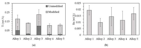 The positive effect of the modifier on various structural components of Al–Si alloys is stipulated by the modifying impact of titanium and barium. Spectral analysis data (Figure 9) confirm that Ti and Ba are successfully transformed into the melt in the amount sufficient for modification and within permissible concentration (Figure 9). The concentration of modifying elements in alloys is provided in optimal amounts: Ti—0.1–0.2 wt% and Ba—0.010–0.020 wt%.