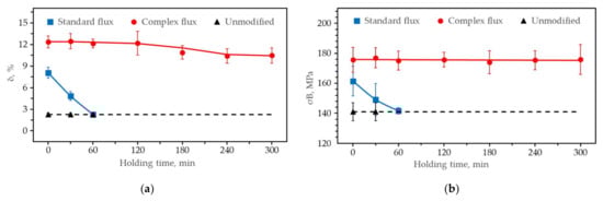 The results of mechanical tests are given in Figure 10. According to the data obtained, the time of action of the complex flux during casting is 5 h, while the standard flux retains its modifying effect only for 30 min.