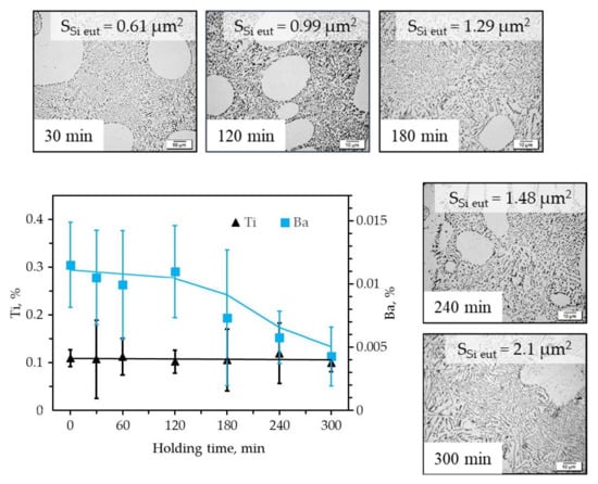 The structure of the alloy held up to 2 h is completely modified and represents a eutectic with the refined and spheroidized silicon (Figure 11). The average area of eutectic silicon increases from 0.48 μm2 for no exposure to 2.1 μm2 for 5 h exposure. Nevertheless, after 5 h of exposure, silicon is significantly refined compared to an unmodified alloy. The extension of the holding time up to 5 h results in the growth of the particles of eutectic silicon, which is caused by the partial burn-off of the modifying elements (Figure 11).