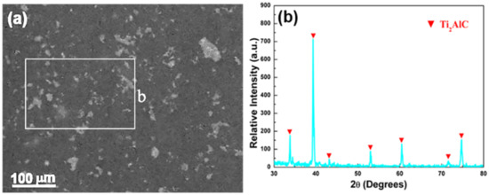 (a) SEM back-scattered electron (BSE) image of the Ti2AlC and (b) corresponding XRD (X-ray diffraction) result.