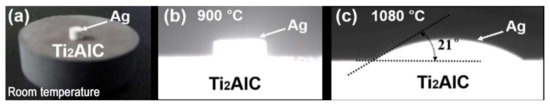 Wetting experiment of Ag on the Ti2AlC conducted at 1080 °C for 5 min using the sessile drop method: (a) before wetting; (b) 900 °C; (c) 1080 °C.