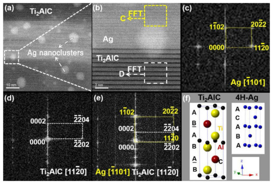 TEM results of the Ag–Ti2AlC interaction zone along the crystallographic orientation of : (a) HAADF–STEM image; (b) magnified white box in (a); (c,d) FFT (fast Fourier transformation) results of the Ag and Ti2AlC in (b); (e) FFT result of the Ag–Ti2AlC interface in (b); (f) schematic drawings of the crystal structures of 4H–Ag and Ti2AlC.