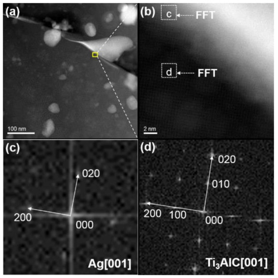 TEM results of the Ag and Ti2AlC at the grain boundaries: (a) HAADF–STEM image; (b) high-resolution TEM image of yellow box in (a); (c,d) FFT results of (b).