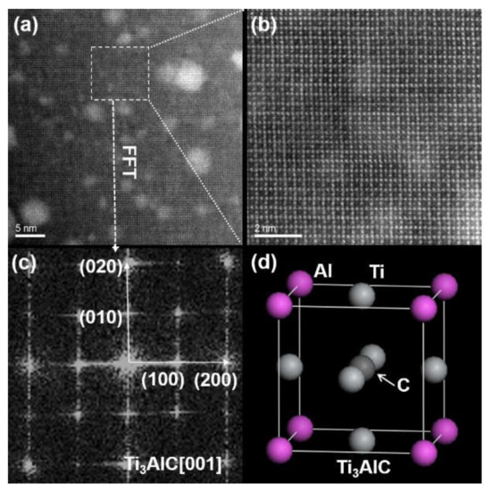 Figure 5 describes the detailed TEM results of the Ti3AlC. It can be seen from Figure 5a that a number of Ag nanoclusters with different sizes are scattered in the Ti3AlC. Figure 5b shows the atomic arrangement of the white dashed box in shown in Figure 5a. Observing the investigated zone axis, it can be shown that the Ti3AlC lattices are composed of regular square grids with three atoms at each side and one atom in the center. The FFT in Figure 5b yields the diffraction patterns shown in Figure 5c. In general, diffraction does not occur easily on the crystallographic planes of (010) and (100) under the zone axis of [001] for the cubic structure. However, for the Ti3AlC with an anti-perovskite cubic structure, the diffraction could happen at such a position [37,38,39]. Actually, the anti-perovskite Ti3AlC belongs to a metallic carbide, as presented in Figure 5d. A single cell contains Ti atoms at the face-centered position, Ag atoms at the corner position, and a C atom at the body-centered position. Compared to the Ti2AlC, the Ti3AlC can be described as a Ti6C octahedron placed in a cubic Al cell. The lattice arrangement of the Ti3AlC obtained by projection under the zone axis of [001] corresponds to the lattice arrangement in Figure 5b perfectly; that is, the face-centered position in the Ti3AlC contains Ti atoms, and their projection position is located at the center of the square gird and side length. The vertex position contains Al atoms, corresponding to the vertex position of the square grid in Figure 5b. The body-centered position contains the C atom, while its projection position overlaps the position of the Ti atom at the face-centered position. This demonstrates that the gray phase in the yellow box (Figure 4a) should belong to the Ti3AlC.