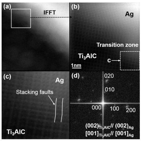It has been mentioned in Figure 1 that no Ti3AlC was observed in the Ti2AlC substrates. Therefore, the Ti3AlC (Figure 4 and Figure 5) should be produced through the interaction of Ag with Ti2AlC during high-temperature treatment. The high-resolution TEM of the Ag–Ti3AlC interface is shown in Figure 6a and its inverse FFT result is shown in Figure 6b. The Ag and Ti3AlC can be distinguished from the figure because the size of the Ag lattice is one-quarter of the Ti3AlC. Despite this, the interface of Ag and Ti3AlC shares a completely coherent relationship. It can also be detected that a small lattice mismatch occurred at their phase boundaries. This lattice mismatch accumulation resulted in apparent lattice distortion. The lattice-distortion-driven stacking faults can be seen in Figure 6c (magnified white dashed box shown in Figure 6b). The FFT result of Figure 6a is shown in Figure 6d. It is worth noting that only a set of diffraction patterns can be detected, which hints that the diffraction patterns of the Ag and Ti3AlC should overlap. The overlapping phenomenon arises because they have a similar crystal structure and share a coherent relationship at the interface. Based on this, the crystallographic orientation relationship between the Ag and Ti3AlC can be described below: