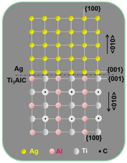 Figure 7 presents atomic models of the Ag and Ti3AlC, showing their crystal structure and crystallographic orientation relationship. The lattice of the Ag and Ti3AlC obtained through projection under the zone axis of [001] is arranged along the crystallographic plane of (001) symmetrically, leading to a coherent relationship. Based on this, the formation mechanism of the Ti3AlC can be inferred (Figure 8). It is worth noting that the Ti2AlC lattice was formed through the alternating distribution of Ti–C octahedrons and Al atom layers. When the heating temperature exceeded the melting temperature of Ag (~961 °C), Al separated from the Ti2AlC and dissolved into the liquid Ag at the grain boundaries. When the loss of Al concentration reached the critical level, Ti2AlC destabilized, leading to the rearrangement of Ti–C octahedrons and Al atoms. For this, the Ti2AlC with the hcp structure was transformed into the anti-perovskite Ti3AlC with a face-centered cubic (fcc) structure locally. The cubic Ag was solidified along the Ti3AlC epitaxially during cooling and a coherent relationship was shared between them.