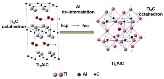 Schematic description of the transformation from the Ti2AlC to Ti3AlC. HCP: a hexagonal close-packed. FCC: face-centered cubic.