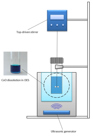 DES based on choline chloride/sulfosalicylic acid in molar ratio of 7:3 was used as a solvent. Reagents were weighed on analytical scalesHR-100AZ (AND, Tokyo, Japan) and then placed in 10 mL glass vials. For DES formation vials were stirred for 120 min (1250 rpm) at 90 °C on a magnetic stirrer C-MAG HS 4 (IKA, Staufen, Germany) in glycerin bath. The investigation of Co(II), Ni(III) and Mn(III) oxides dissolution in DES was carried out in glass vials with a constant interphase area of 1.54 cm2 at mass ratio of solid/liquid equal to 1:50. Experiments were performed in thermostatic conditions at 80 °C and stirring rate of 125 rpm. The ultrasonic generator Grad-Technology 28–35 C (Grad-Technology, Moscow, Russia) with a capacity of 110 W and a frequency of 35 kHz was used for experiments with ultrasound. The experimental setup is shown in Figure 1.