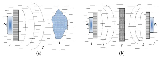 Possible schemes of erosive action on solid particles with ultrasonic cavitation assistance: 1—ultrasonic emitter; 2—ultrasonic wave; 3—target; (a)—running ultrasonic wave usage; (b)—standing ultrasonic wave usage.