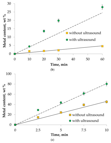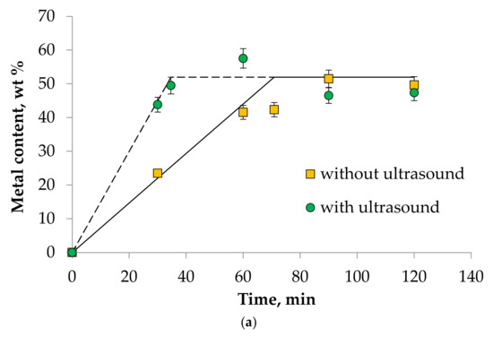 The theoretical curves in Figure 5 that represent the corresponding function proportional to M0(τ) according to relationship (19) were obtained for the ultrasound amplitude Pm = 0.4 MPa and the following parameters of the liquid: α = 0.075 kg/s, κ = 1021 m−3, ρM = 8 × 10−3 kg/m3, ω = 35 kHz, P0 = 0.1 MPa, Pg = 0.01 MPa and S = 1.5 × 10−4 m2. As one can see, experimental data correlates well with theoretical calculations, which confirms the correctness of the developing picture about the physicochemical nature of the metal oxide dissolution in DES. Simultaneous operation of several US-caused aspects accelerating the dissolution (e.g., direct effect on the kinetics) leads to distortions not observable in the case of exclusive erosive cavitation contribution. Apparently, such a case is shown in Figure 5b. However, its detailed analysis and identification of the reasons for the discrepancy between theory and experiment is the subject for an independent large-scale study on the direct effect of ultrasound on the kinetics of dissolution.