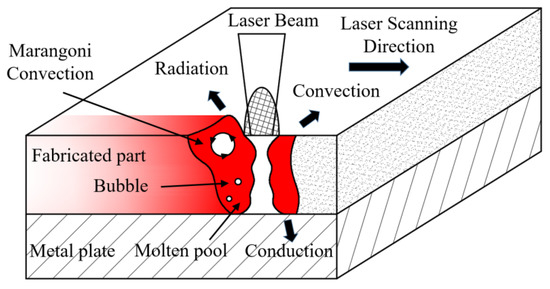 The heat generated by the laser during the printing, firstly, is used to melt the metal powders to transform the phase of materials; secondly, it is reflected by the surface of the metal powders; finally, the metal in the molten state is thermally conductive with its adjacent powders and the fabricated part, and thermally radiated with the air in the printing chamber. Moreover, the phase transition of the material, the heat transfers and other complex physical phenomena would be appeared simultaneously in a short period of time, as shown in Figure 1. As mentioned above, only when the energy provided by the laser is the same as the energy required to melt all the powder on the path and related losses, high relative density printed component can be obtained.