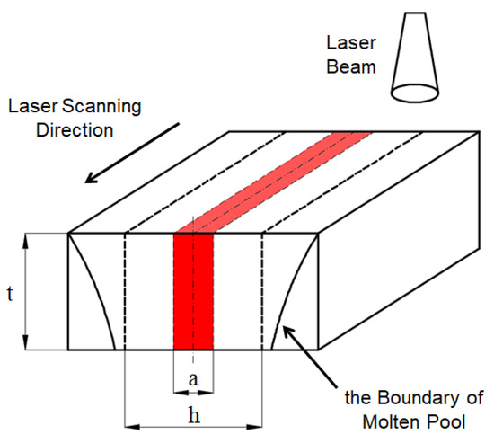 In order to calculate the required energy for the metal particles melting during printing easily, the temperature field of the specimens (small cubes) is simplified as described in Section 2. The laser spot diameter is about 0.1mm, and the hatch space during printing is 0.19 mm. According to the simulation results of the temperature field by Du et al. [32], the maximum temperature of the molten pool during printing can reach about 2300 °C. This temperature will drop below the solidus of the material within 1ms. Therefore, the width of the red area in Figure 4 is the range of the laser spot (a = 0.1 mm), and the temperature is set as 2300 °C; the white area in Figure 4 is the interval between the two adjacent paths of the laser (h − a = 0.09 mm), and the temperature is set as 597 °C.