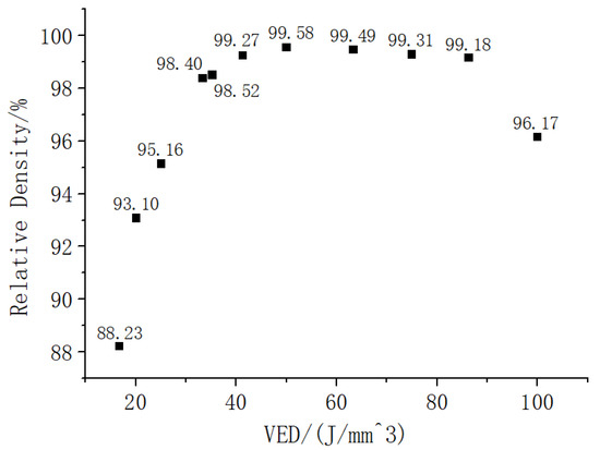 Figure 6 shows the relative density of specimens fabricated by different energy of heat input. As shown in Figure 7, the relation density was increased first and decreased with the energy of heat input increasing. When the VED is 49.933 J/mm3, the relative density of the specimen reaches the maximum value of 99.58%. The relation density was greater than 99%, when VED was range between 41 J/mm3 and 86 J/mm3.