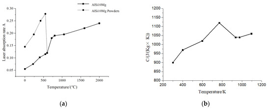 The thermophysical properties of AlSi10Mg. (a) AlSi10Mg laser absorptivity ; (b) AlSi10Mg specific heat .