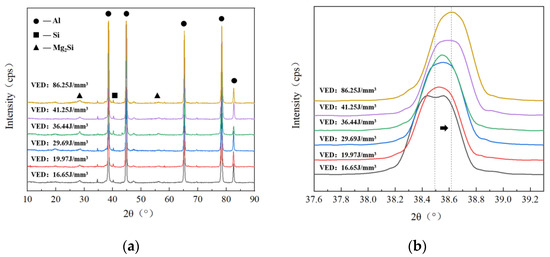 Figure 8a shows the XRD results of different VED components. It can be seen from Figure 8b that as the VED increased, the diffraction peak of Al shifted to the right continuously. The following Equation (11) is the Bragg equation, and the following Equation (12) is the relationship between the interplanar spacing (d) and the lattice constant (a) of the cubic crystal (α-Al is the face center cubic (FCC) structure).