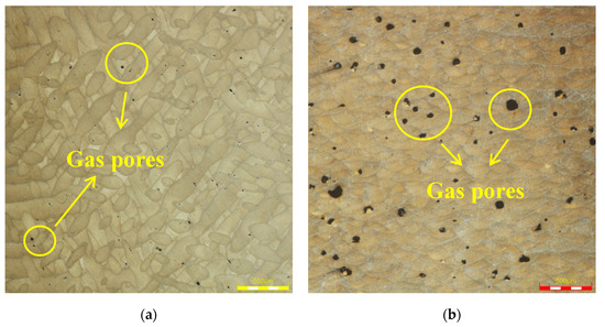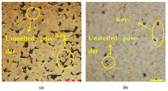 The internal structure of the component under different VED. (a) The internal structure of the component when VED is 16.644 J/mm3 (×1000); (b) The internal structure of the component when VED is 99.865 J/mm3 (×1000).