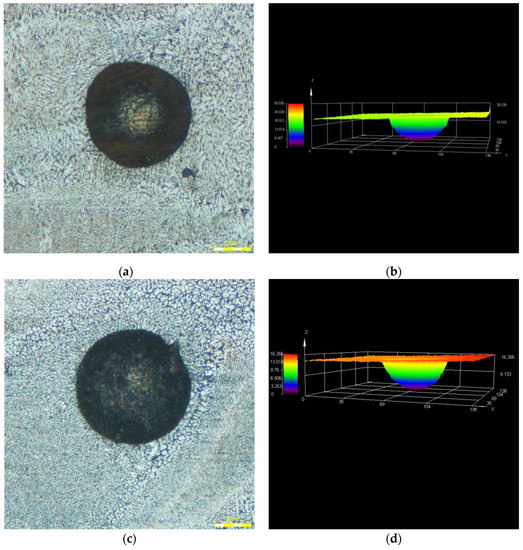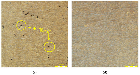 Figure 12 shows the metallographic of different VED specimens when the VED is larger than 86. As shown in Figure 13, the defects within specimens are mainly gas pores. This is because when the energy of heat input is large, the metal particles absorb too much laser energy per unit volume per unit time. As a result, the shielding gas cannot escape from the molten pool in time. Ultra-depth images of the pores are shown in Figure 13a–d. It can be seen from them that the shape of the pores is relatively regular and is substantially ellipsoidal. In addition, the surface inside of the pores is relatively smooth.