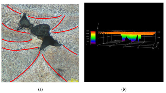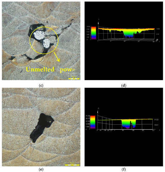 Figure 10 shows the metallographic of different VED specimens when the VED is smaller than 41 J/mm3. In Figure 10, the defects within specimens are mainly keyholes, and there are also unmelted powders in them. This is because the laser provides insufficient energy to melt all of the metal powders. During the LPBF printing, the cross-section of the molten pool is generally semi-elliptical. When the energy of heat input is small, that is, the scanning speed is too fast or the hatch space is too large, the metal powders on the target path cannot be completely melted, especially at the junction of two adjacent molten pools, as shown in Figure 11a. Therefore, the shape of the keyhole is mostly irregular, and the nonmelted powders can also be found in the keyhole sometimes. The ultra-depth of field image of the keyhole was shown in Figure 11a–f. It can be seen from Figure 11 that the three-dimensional shape of the keyhole is irregular and the inside is rough.