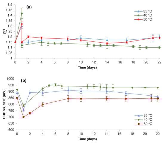 After that, it increased relatively rapidly, within 1–7 days, due to the microbial oxidation of ferrous iron (Equation (5)), and stabilized at the level of 860–911, 930–943, and 845 mV (vs. standard hydrogen electrode (SHE)) at 35, 40, and 50 °C, respectively. A lower value of the redox potential at 50 °C was due to the low concentration of ferric iron in the liquid phase of the pulp, as a result of its more pronounced precipitation in the form of jarosite (see Table 3). An increase in the temperature during the bioleaching of sulfidic raw materials is known to lead to a greater jarosite formation [34,35]. Changes in the ferrous and ferric iron concentrations in the liquid phase of the pulp at different temperatures (Figure 2) confirmed this conclusion. At all temperatures studied, the microbial communities oxidized ferrous iron completely and relatively rapidly. Beginning from the fourth day of bioleaching, the ferric iron concentration remained almost constant due to the low pulp density and relatively low iron content (21.8 wt %) in the concentrate.