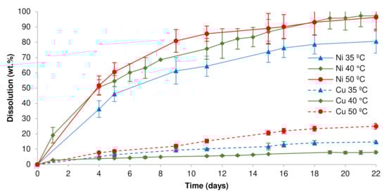 Figure 3 shows the dissolution of nickel and copper during bioleaching of the concentrate at different temperatures. The lowest dissolution of nickel was recorded at 35 °C. At 40 and 50 °C, the final nickel dissolution was close and reached 97.2 and 96.3 wt%, respectively. The highest dissolution of copper was observed at 50 °C. A greater dissolution of chalcopyrite (as well as other sulfide minerals) by thermotolerant and moderately thermophilic microorganisms in comparison with mesophiles is well known. Among other factors, it is caused by an increase in the rate of chemical reactions with increasing temperatures [36,37,38]. Moreover, an increase in the solubility of chalcopyrite in ferric sulfate solutions has been repeatedly shown at relatively low values of the redox potential [39,40,41]. Figure 2 indicates that the value of the redox potential was, on average, 100 mV less during bioleaching of the concentrate at 50 °C than at 40 °C. Choosing a more suitable temperature of these two and taking into account that the goal of bioleaching was to achieve the greatest removal of nickel and to obtain a high-grade copper concentrate as solids, a community growing at 40 °C should be selected.