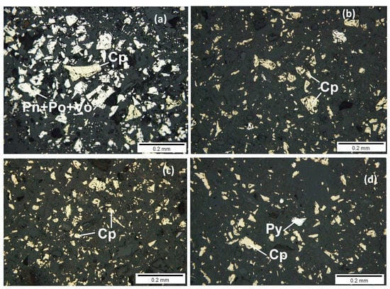 Solids were analyzed by a wet chemical method, using 1:3 concentrated nitric acid/concentrated hydrochloric acid at the boiling temperature of the mixture. This analysis was followed by FAAS for metals and gravimetric analysis with BaCl2 for sulfur [32]. The mineralogical composition of solids was determined with X-ray diffraction microscopy (DRON-2 diffractometer, Burevestnik, St. Petersburg, Russia). The Rietveld refinement of the XRD patterns was used to evaluate the relative mineral phase amounts [33]. For image acquisition, a reflected light optical microscopy (Olympus BX51 microscope, Olympus, Tokyo, Japan) was used. The microscope was set to operate using polarized reflected light. The samples of solids were mounted in polished sections embedded in epoxy resin.