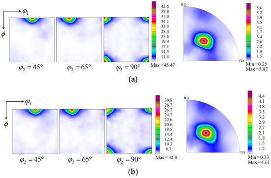ODF and {111} pole figure for (a) T4 and (b) O temper sheets.