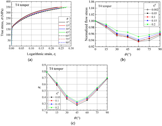 For the T4 specimen, the uniaxial tension tests were conducted for two duplicate specimens. The difference in the flow stresses was less than 1%, and the reproducibility of the experiment was satisfactory in capturing the anisotropy of the specimen. Figure 2a shows one of the duplicate true stress–logarithmic strain curves of the T4 specimen. The flow stress was the highest at 0° and the lowest at 60°. The flow stress at 0.002, 0.05, 0.1, 0.15, and 0.2 was determined and normalized by that for 0°. The normalized flow stress is shown in Figure 2b. Here, the mean values of the two duplicate results are plotted. The normalized flow stress was unity at 0°, it decreased to the lowest value of approximately 0.94–0.95 at 60°, and increased to approximately 0.96 at 90°. The normalized flow stress was concave upward, and this trend was retained irrespective of the amount of applied strain. Figure 2c shows the R values at 0.05, 0.1, 0.15, and 0.2. The mean value of the two duplicate experiments was plotted, and the difference in R for the duplicate experiments was 0.02 at most. was approximately 0.8, 0.3, and 0.7 at 0°, 45° and 90°, respectively. The lowest R in 45° is a typical feature of a cube textured sheet [23,24]. The R value increased slightly as the plastic strain increased.