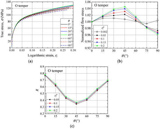 Results of uniaxial tension for O temper sheet. (a) True stress–logarithmic strain curve; (b) Normalized flow stress; and (c) R value.
