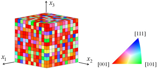 In the simulation, a polycrystal model consisted of 1728 (=12 × 12 × 12) elements as shown in Figure 4. An eight-node element with selective reduced integration was used. One crystal orientation was assigned to one element, and the polycrystal model possesses totally 1728 crystal orientations. The 1728 crystal orientations were generated from the experimental ODF. A procedure to obtain the 1728 discrete crystal orientations from ODF is described in Appendix A.