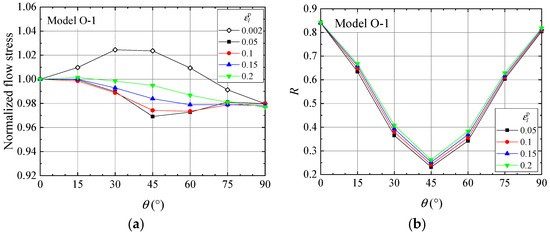For all simulations of the O sheet, material parameters were set as 9.5 MPa, , 27 GPa, m, (initial value), 0.002, and 0.002. Material parameters and were identified such that the predicted true stress–logarithmic strain curve for 0° agreed with the experimental curve. Uniaxial tension for the O sheet was performed with five sets of the interaction matrix denoted by O-1 to O-5, listed in Table 2. For model O-1, the components of the interaction matrix were taken as for all interactions, for the self and coplanar interactions, and for the other interactions. The predicted flow stress and R value are shown in Figure 5a. The normalized flow stress was less than unity in most of the loading directions, except for those at . These predictions were considerably different from the experimental results (Figure 3b). The predicted R value is shown in Figure 5b. The R value was the lowest at 45°, and it increased with the plastic strain. Thus, the predicted R value was similar to the experimental observations. Closer examination reveals that the predicted R values at 0° and 90° are higher than the experimental results, and those at 45° are lower. The difference is approximately 0.1 at most.