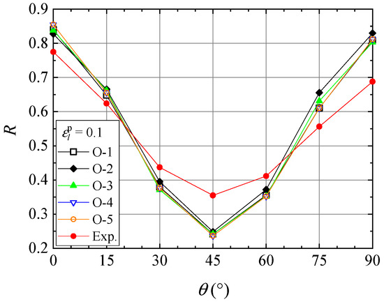R values predicted with model O-1, O-2, O-3, O-4, and O-5 are compared with the experimental results of the O temper sheet. R value is evaluated at .