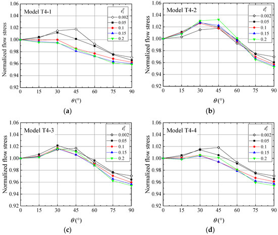 Figure 8a shows the predicted normalized flow stress for model T4-1, for which all the interaction coefficients are set to unity, i.e., . The predicted variation of the flow stress was similar to that for the model O-1, for which for all interactions. The flow stress around 45° was initially higher than unity and subsequently became lower than unity. For the strain range of , the predicted normalized flow stress was similar to the experimental results, though the flow stresses around 45° and 60° were much lower in the experiment. Contrary to the O sheet, the interaction matrix of predicts the experimental trend of the variation of flow stress for the T4 sheet.