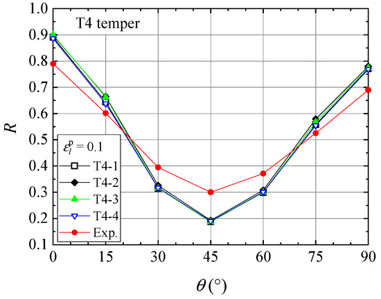 The predicted R values for the models T4-1 toT4-4 are shown in Figure 9. Contrary to the flow stress, the variation in the R value was not affected by the interaction matrix . This result is consistent with those for the O specimen.