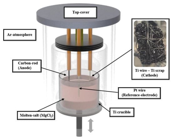 High-purity Ar gas was inserted into a glove box containing a lift furnace, as shown in Figure 1. Process materials were selected by considering the thermodynamic simulations from FactSage software to avoid unnecessary reactions of molten salt and materials on the equipment. A total of 4.5 kg of MgCl2 (99.9%, Kojundo Chemical Laboratory Co., Sakado, Japan) was placed in a crucible made of Ti, and the temperature was increased to 900 °C and maintained until the MgCl2 was completely melted. Ti wire (⌀ 10 mm × 200 mm), C rod (⌀ 15 mm × 220 mm), and Pt wire (⌀ 6 mm × 200 mm) were used as working, counter, and reference electrodes, respectively, which are non-reactive with the electrolyte and have chemical and electrochemical stability using thermodynamic software. To proceed with the deoxidation process, certain ranges of different voltages were applied to the cathode electrode, which was set up with target brittle Ti scraps that were tied to the Ti wire. After deoxidation treatment, the Ti scrap was washed with 1 M citric acid, 0.5–8 M HCl solution, and 12 M H2SO4 diluted solution to remove the MgO and residual chlorides by stirring on a magnetic stirrer at 150 rpm for 30 min, and the washed Ti scrap was then dried in a vacuum atmosphere.