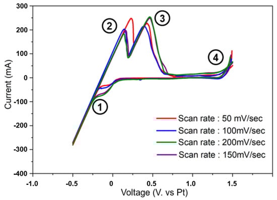 The Ti deoxidation reaction occurs by the following mechanism. Oxygen present in the titanium scrap cathode reacts with Mg ions in MgCl2 molten salt flux to form MgO, thereby removing oxygen from Ti. At this time, since a voltage is applied, the formed MgO that cannot be remelted due to limited MgO dissolution with molten MgCl2 flux is decomposed into Mg and oxygen ions by electrolysis. The divided Mg can participate in the deoxidation reaction again. Therefore, before applying a voltage to initiate the deoxidation process, CV analysis was performed to measure the appropriate cell potential between the electrodes and to confirm the behavior of electrolyte ions. CV analysis was conducted at a voltage range of 1.5 V to −0.5 V at 1103 K with a set of four scan rate ranges, as shown in Figure 2. As shown in Figure 2, some intensities indicate redox reactions of Mg, MgO, O, and Cl−. In the range of −0.5 to 0.0 V, in the CV curves marked numbers 1 and 2, various intensities indicate the reduction of the added Mg compounds, and in the range of −0.5 to 0.0 V, the CV curve marked number 1 suggests the formation of current by Mg ion reduction. In addition, according to the reference, the time point at which Mg is decomposed occurs in the −0.25 section, where the peak falls dramatically. As the voltage increases to −0.5 V, in this part, it can be seen that the Mg ions generated by dissolution in the MgCl2 salt flux are decomposed by excessive voltage, and the oxidation peaks occur at 0.0 V for Mg+ ions and at 0.5 V for oxygen, as shown by the curves marked numbers 3 and 4. As the chloride is decomposed from 1.5 V, as confirmed in the curve marked number 5, the optimized voltage potential can be considered to be in the range of −1.0 to 1.5 V. Despite the voltage potential obtained from the CV analysis, the theoretical conditions for applying voltages were considered over ranges of measured potential due to attempts to form high currents. Because the Mg ions are reduced by the applied voltages at the cathode electrode, higher currents were expected to result in more efficient deoxidation. The resulting O species, present mainly as O2− dissolved in molten MgCl2, reacted at the C anode to form COx gas, which was removed from the molten salt system.