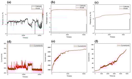 CA analysis results for formed electrode potential and currents during the deoxidation process under different applied voltage conditions. −0.2 V (a,d); −2 V (b,e); −3 V (c,f).