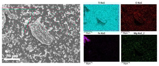 The internal Ti scrap showed a higher deoxidation efficiency than the external Ti scrap. This result could be due to various factors. When the Ti scrap is separated from the molten salt electrolyte after the deoxidation process, a negligible amount can be instantaneously oxidized by oxygen in the equipment. Furthermore, the MgO formed by reaction with oxygen and impurities, such as iron and aluminum, in the scrap manufacturing process may be dissolved and remain in the solid solution, which was confirmed by EDS surface mapping analysis, as shown in Figure 5. More precisely, it was confirmed that many unidentified impurity particles and salts existed on the surface, and more impurities were present in the case of the external Ti scrap. In the analysis using EDS mapping and spectral points, it was confirmed that the impurity particles containing Mg, O, Fe, and Cl also contained a significant amount of oxygen.