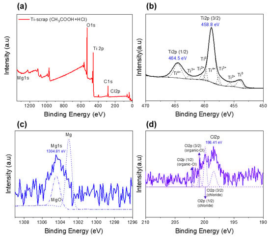 XPS results of Ti scrap with deoxidation and conventional washing: full spectrum (a) and designated elements (b–d).