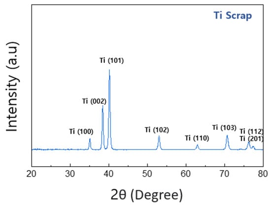 Thus, in the spectral results of the Ti element, the Ti2p (3/2) point exhibits a binding energy of about 458.8 eV, showing the characteristic of titanium oxide rather than pure Ti. XRD analysis was performed for more detailed and clearer identification, and the results confirmed that this Ti scrap had a clear titanium phase rather than titanium oxide, as shown in Figure 7. This is considered to be the result of the XPS characteristics due to the formation of the aforementioned titanium film and the penetration of relatively thin electrons compared with XRD analysis [33]. Subsequently, it was confirmed by the results in Figure 6c that this sample contained a small amount of MgO, as expected from the EDS analysis. The binding energy of Mg1s was confirmed to be Mg oxide (1304.5 eV) rather than Mg metal (1303 eV) [34], which indicates that the impurity particles, which were observed to contain both O and Mg elements in EDS mapping analysis, are more likely to be MgO.
