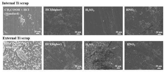 Overall, it was confirmed that the oxygen content in the H2SO4 condition, which showed the highest removal efficiency in the surface analysis after the impurity removal process, was the lowest. As another feature, the measured oxygen content range showed a high error range in the previous samples; nevertheless, a homogeneous oxygen content result with a low error range was derived for a sample with high impurity removal. As shown in Figure 10, the final Ti scrap that underwent deoxidation and leaching processes is cleaner and has a metallic color compared to the previous one. Despite the results of the impurity removal process, the scrap of the part existing outside the compressed Ti scrap still showed lower deoxidation efficiency than that of the internal scrap. This result indicates that the impurity particles contained a certain amount of oxygen; however, the difference in the deoxidation efficiency of the external and internal scraps was not the main reason. Therefore, a small amount of oxygen in the Ar atmosphere or oxygen dissolved in Ti could have had an effect during the removal from the molten salt immediately after the process [39]. As a result, it is presumed that the outer part of the Ti scrap, which was more exposed to high temperature and external atmosphere, absorbed and reacted with the residual oxygen again.