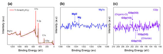 XPS analysis of Ti scrap by proceeding with H2SO4 solution of full spectrum (a), magnesium (b), and chlorine (c).
